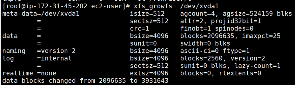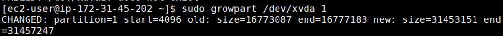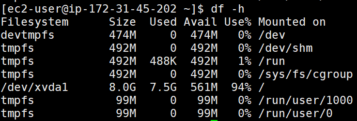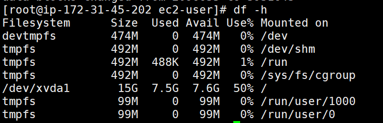 使用df -h命令,此时文件系统依旧为8G,需对xvda1扩容,执行命令: