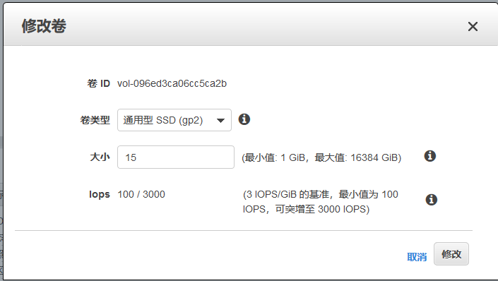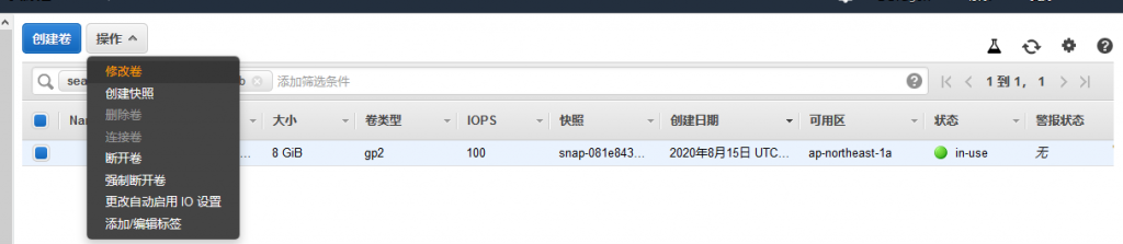 进入EC2控制台,选择想要扩大根卷的实例,找到对应的EBS卷。选择操作->修改卷,如下图:
