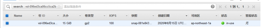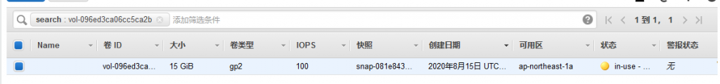 此时卷的状态变为”in-use – optimizing”,等待5分钟左右,当状态为”in-use”时已经成功将EBS卷修改为15G,如下图: